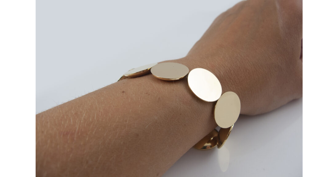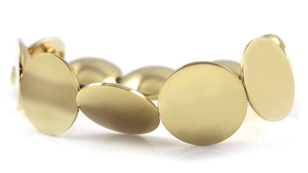 Bei diesem Armband schmiegen sich große Punkte aus Silber beweglich an das Handgelenk und folgen dabei dem Konzept einer Perlenkette. Getragen und ungetragen ein anmutiges Schmuckstück.
