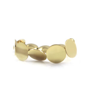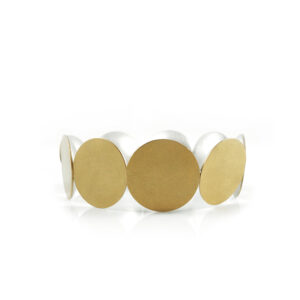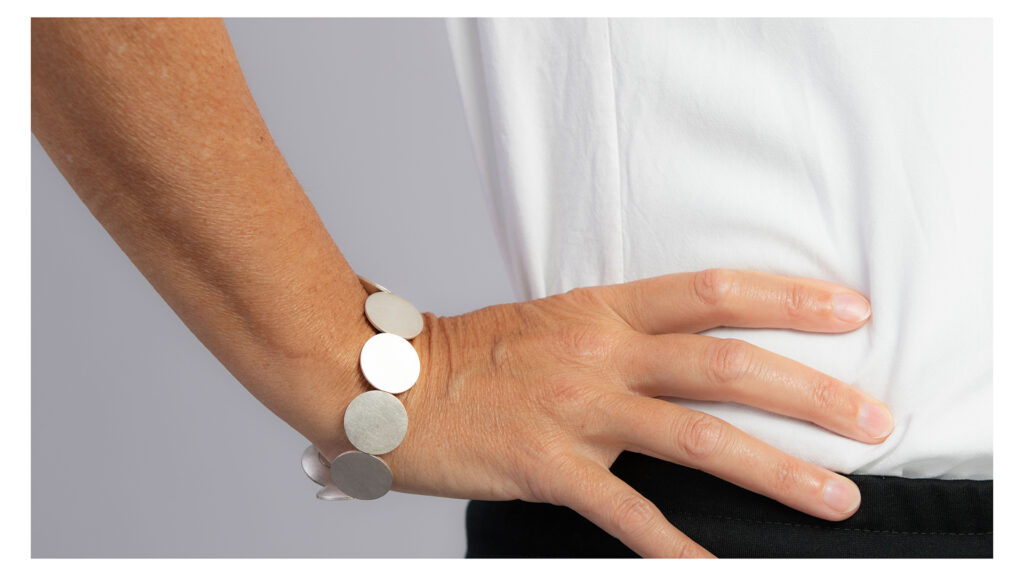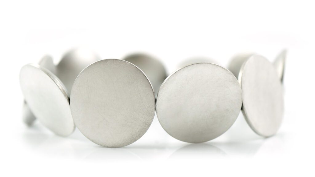 Bei diesem Armband schmiegen sich große Punkte aus Silber beweglich an das Handgelenk und folgen dabei dem Konzept einer Perlenkette. Getragen und ungetragen ein anmutiges Schmuckstück.
