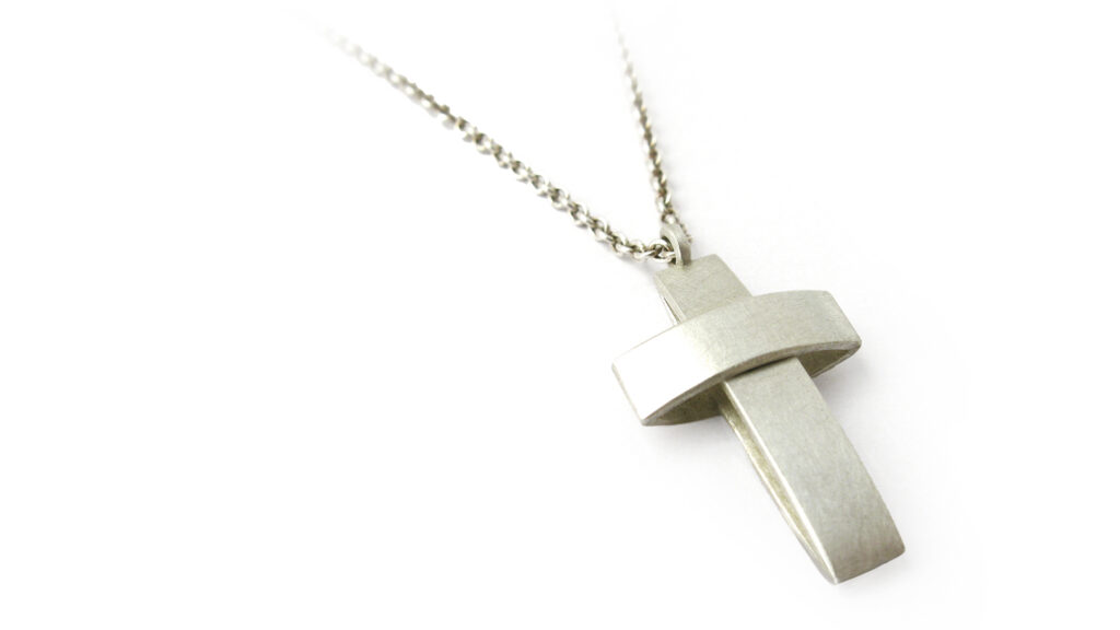 Ein auffälliges Kreuz, bestehend aus breiten Silberstreifen, die sich kreuzen. Ein passendes Geschenk für Konfirmation, Kommunion und Taufe.
