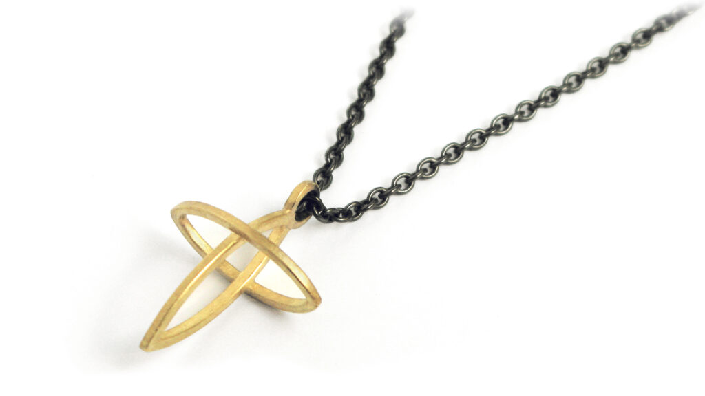 Ein zart wirkendes Kreuz aus Gold, welches durch seine Dreidimensionalität immer wieder neue Perspektiven bietet. Hier hängt es an einem geschwärzten Silberkettchen. Ein passendes Geschenk für Konfirmation, Kommunion und Taufe.