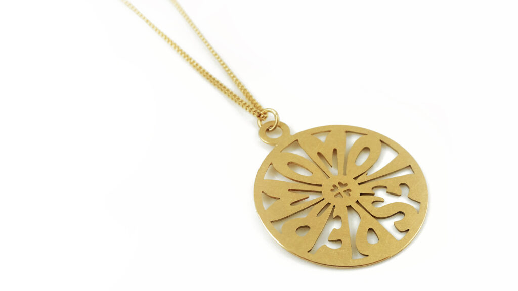 Ein individueller und wertvoller Talismann aus Gold. Dieser schlichte Anhänger ist immer wieder einzigartig mit jeder neuen Inschrift. In diesem Anhänger stehen die Namen MOMO JESPER. Die Mitte ziert ein Kleeblatt aus vier Herzen.