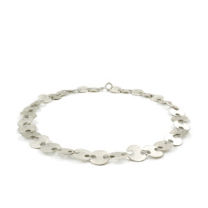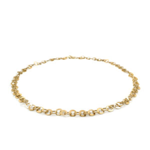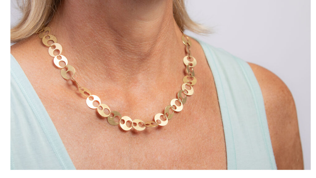 Goldene Kreise schmiegen sich leicht und verspielt um den Hals. Die Löcher, die notwendig sind, um die Glieder ineinander zu hängen, werden bei dieser Kette zum zentrales Gestaltungselement.