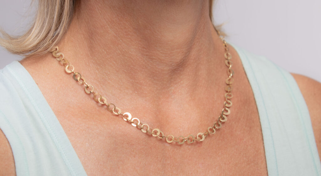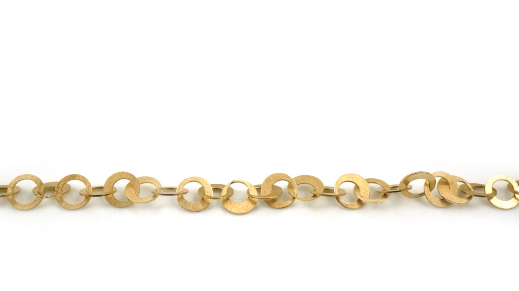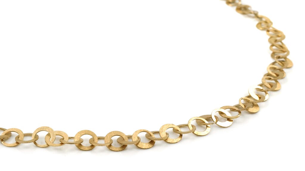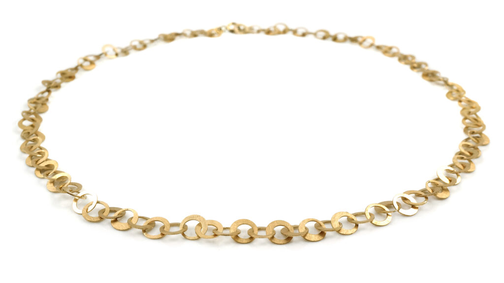 Der Punkt im Punkt hinterlässt kleine Mondsicheln. Die zufällige Unregelmäßigkeit verleiht der Kette eine spielerische Leichtigkeit. Eine Kette, die man gar nicht mehr ablegen möchte.