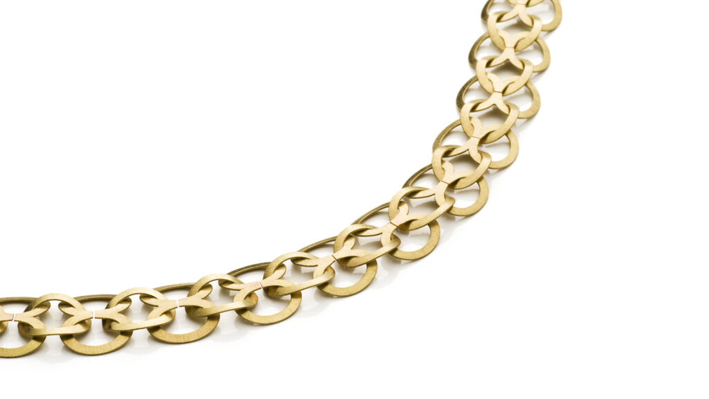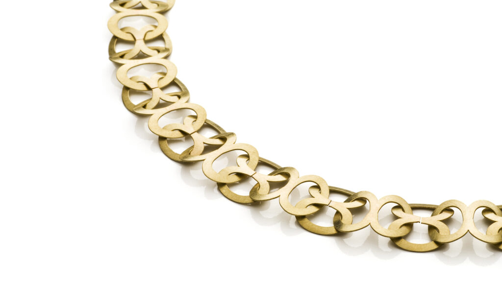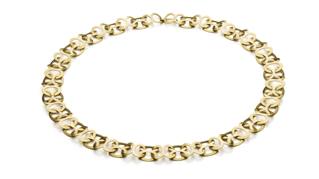 Ähnlich einem Ornamentband legt sich diese Kette geschmeidig um den Hals.
