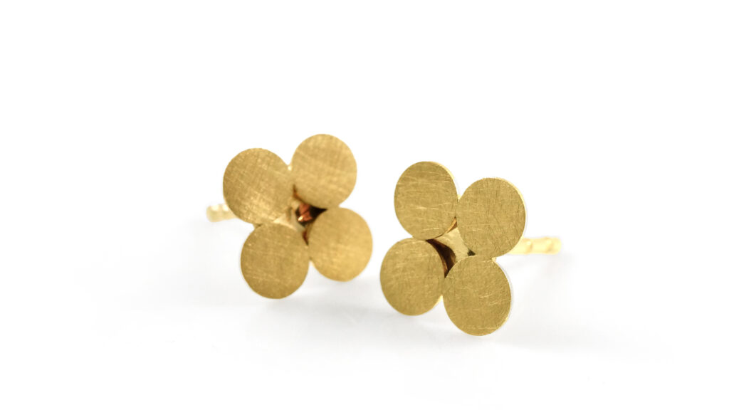 Vier goldene Kreise Im Quadrat mit einem glitzernden Hohlspiegel in der Mitte. Ein spielerisches Design aus zwei Grundformen, die eigentlich eigenständig sein wollen.