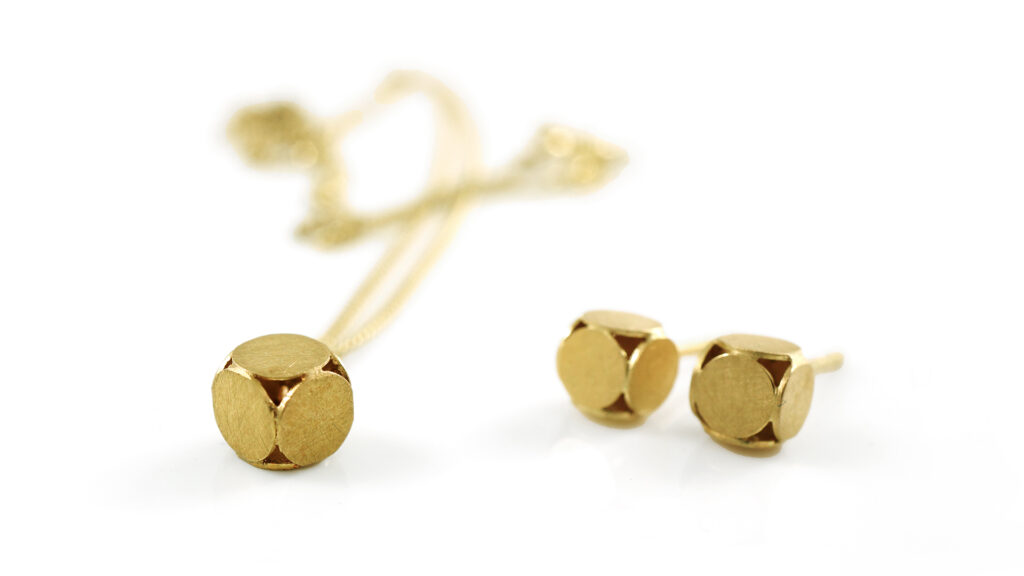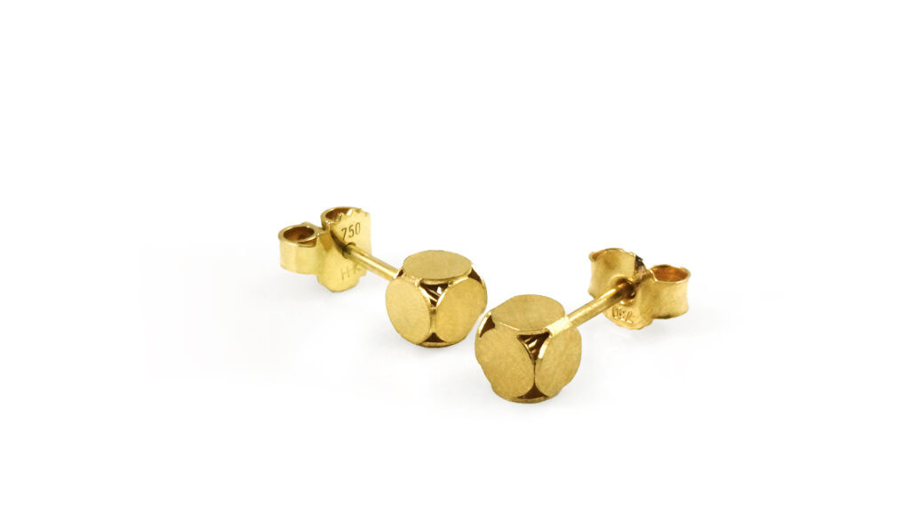 Sechs runde Goldplättchen bilden einen filigranen und leichten Würfel, dessen Kanten aufgelöst scheinen. Diese edle, kleine Skulptur am Ohr, ist ein zart wirkender und außergewöhnlicher Hingucker.