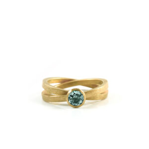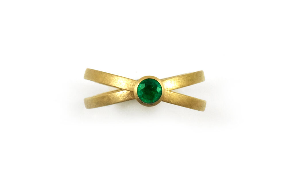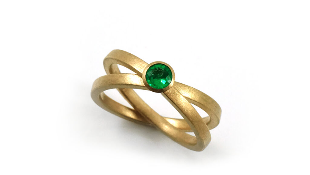 Zwei Ringe überlagern sich und spielen ein Duett. Ein Smaragd krönt ihren Schnittpunkt.