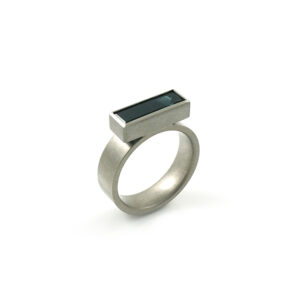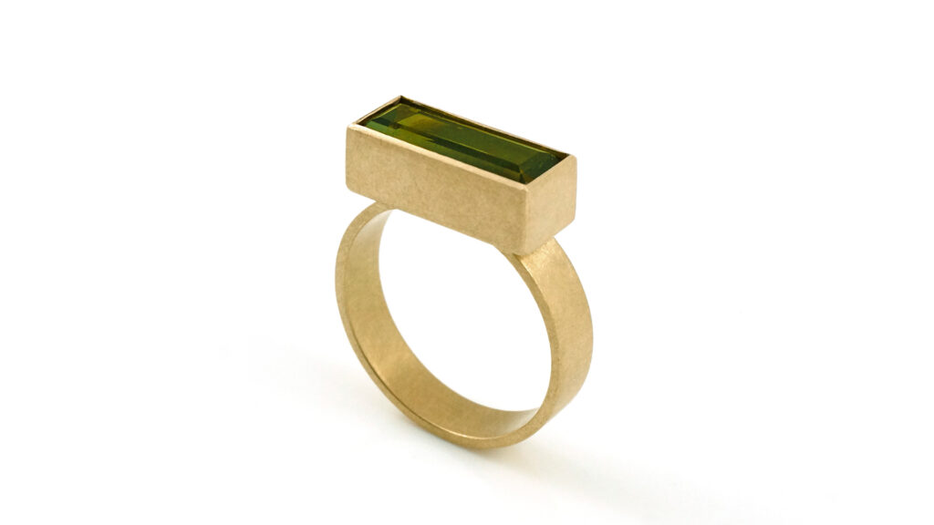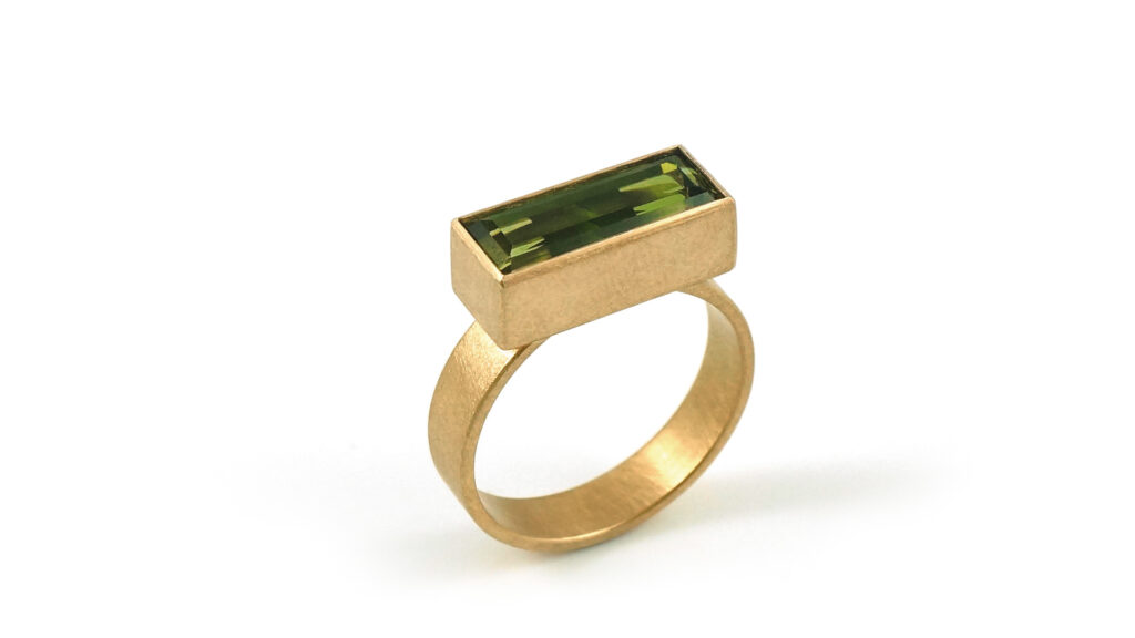 Ein großer rechteckiger Turmalin wird auf einer Ringschiene ausbalanciert und präsentiert sich damit leicht und losgelöst am Finger.
