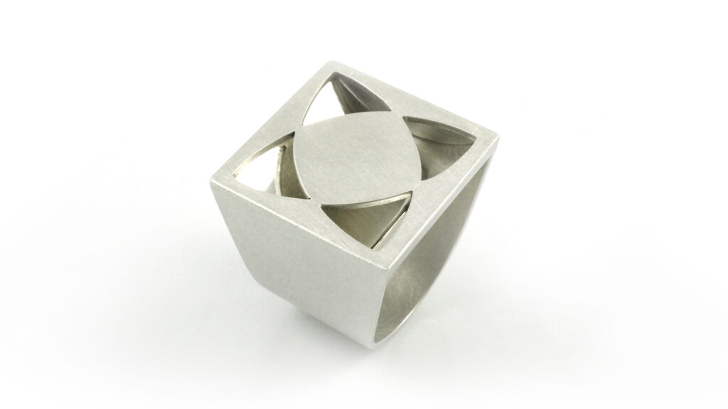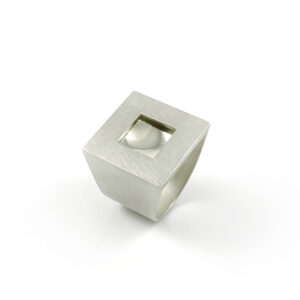 Bei diesem Ring verfängt sich der Blick des Betrachters in dem Wechselspiel von polierter und mattierter Fläche. Die obere Eben spiegelt sich in der unteren wider und schafft auf diese Weise eine räumliche Tiefe und eine spielerische Irritation.