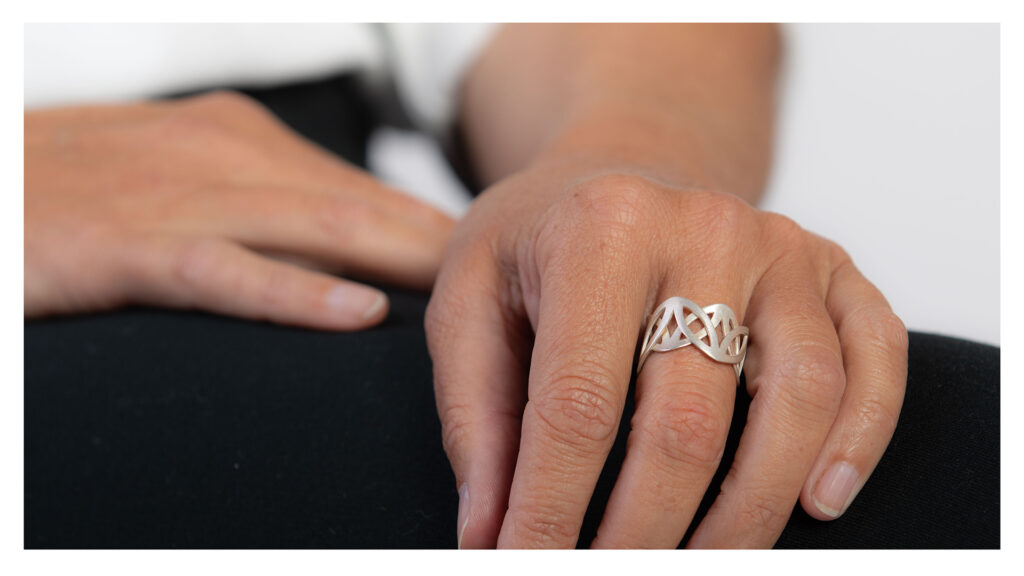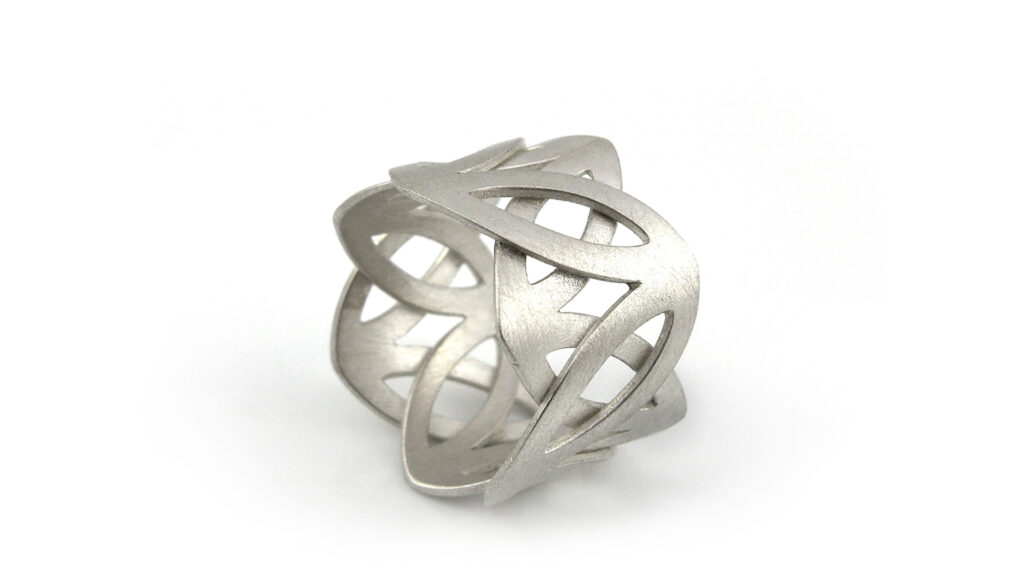 Zwei Ringe werden übereinander gesteckt und vereinen sich zu einer Krone. Das Muster des einen Ringes wird durch das Muster des zweiten Ringes ergänzt. Es entsteht eine Art Flechtwerk.