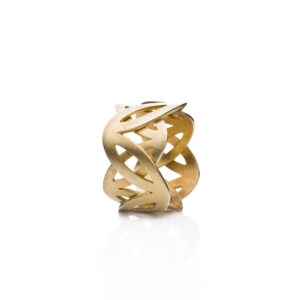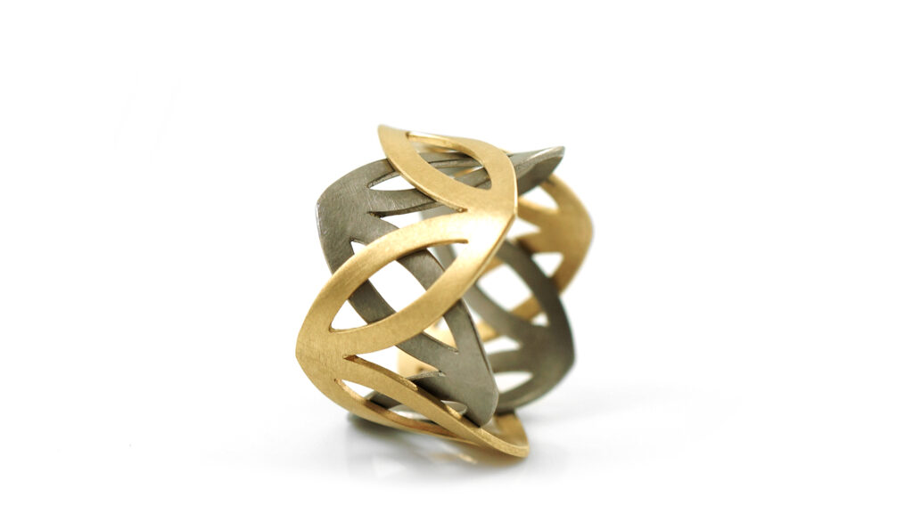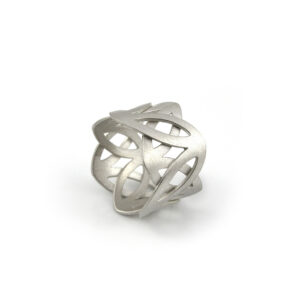 Zwei Ringe werden übereinander gesteckt und vereinen sich zu einer Krone. Das Muster des einen Ringes wird durch das Muster des zweiten Ringes ergänzt. Es entsteht eine Art Flechtwerk.