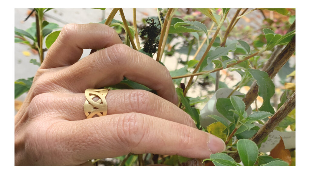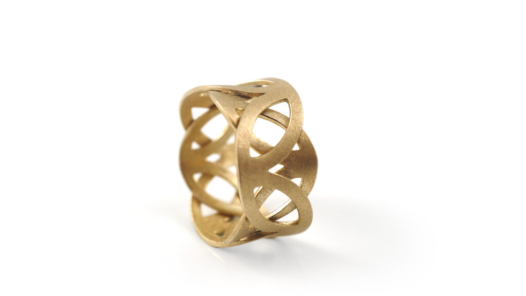 Zwei Ringe werden übereinander gesteckt und vereinen sich zu einer Krone. Das Muster des einen Rings wird durch das Muster des zweiten Rings ergänzt. Es entsteht eine Art Flechtwerk. Diese schmale Variante des Kronenringes ist 12 mm breit.
