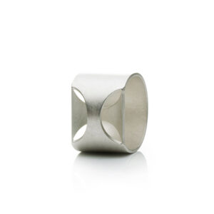 Ein breiter Ring wird aufgebrochen, überschneidet sich partiell, entwickelt Neues und verkörpert dadurch viel Leichtigkeit. Die ovale Form ist die konsequente Fortführung des Aufbruchs und dient zugleich dem Tragekomfort.
