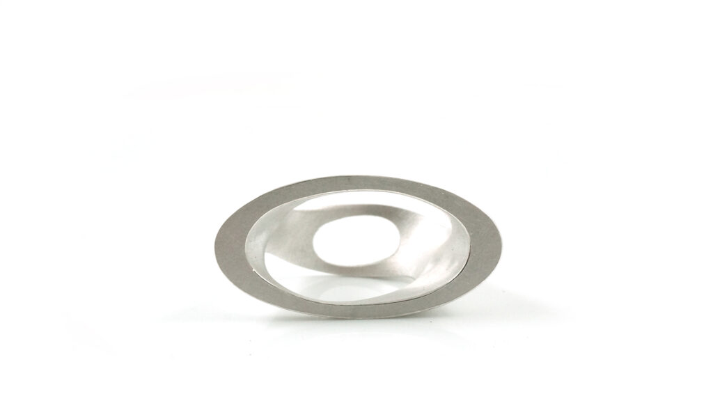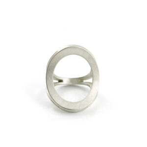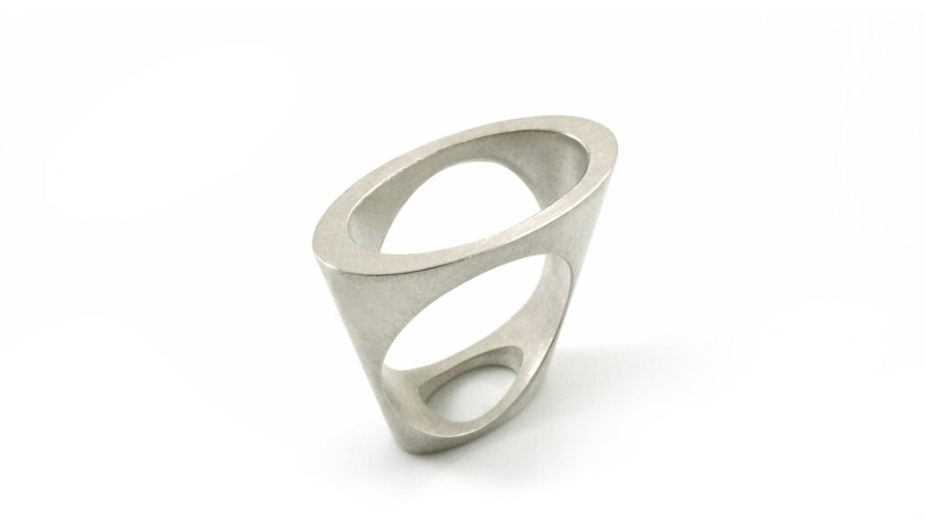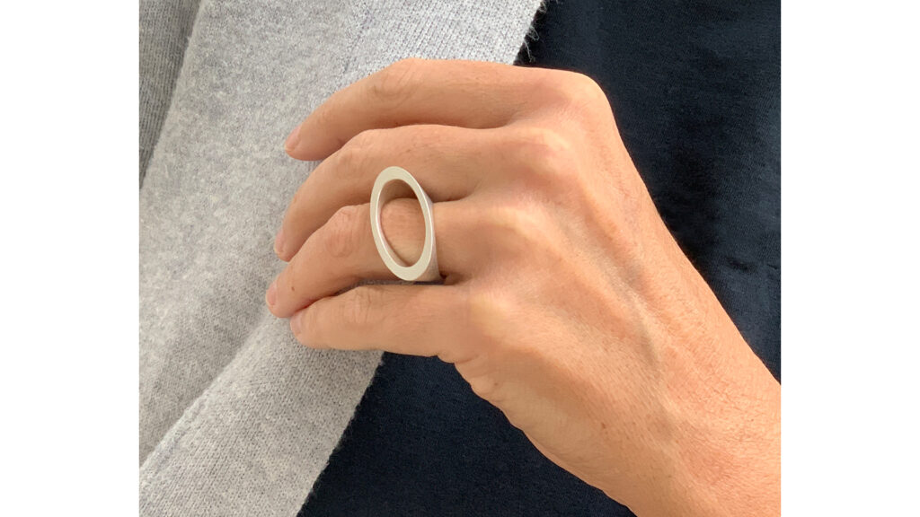 Trotz seines skulpturalen und extravaganten Designs schmiegt sich der große Ring ZERO elegant an den Ringfinger. Getragen ziert ein offenes Oval die Oberfläche der Hand.