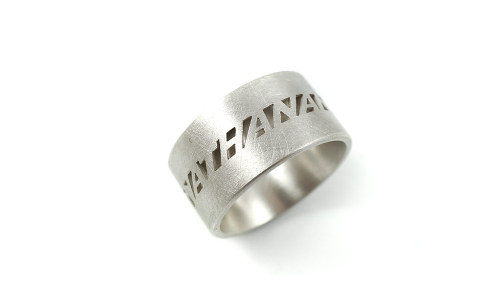Was wie ein umlaufendes Muster aussieht, entschlüsselt sich bei genauem Hinsehen als ein bedeutungsvoller Text oder Name. Dieser kann individuell gestaltet werden. Hier mit einer kursiven Schrift. Der Ring ist 12mm breit.