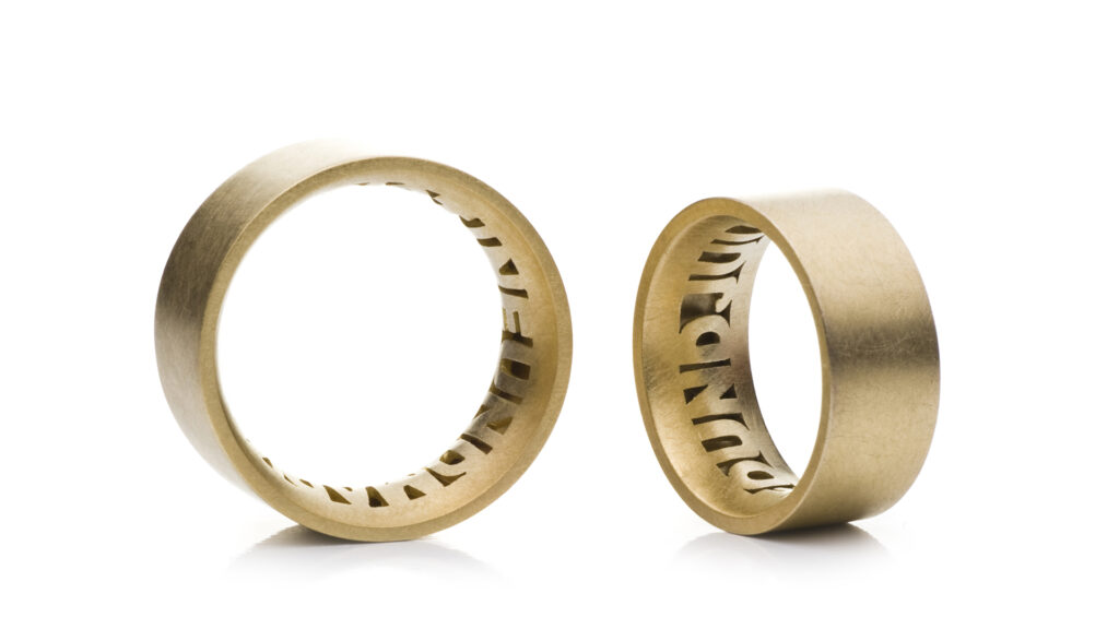 Der Trauring Endlos – ein eleganter und zeitloser Goldring. Das Besondere verbirgt sich im Innern. Anstatt einer herkömmlichen Gravur ergibt sich aus den Namen des Paares ein nicht endendes Band: ROMEOUNDJULIAUND, Die Ringe sind 9mm und 10mm breit.