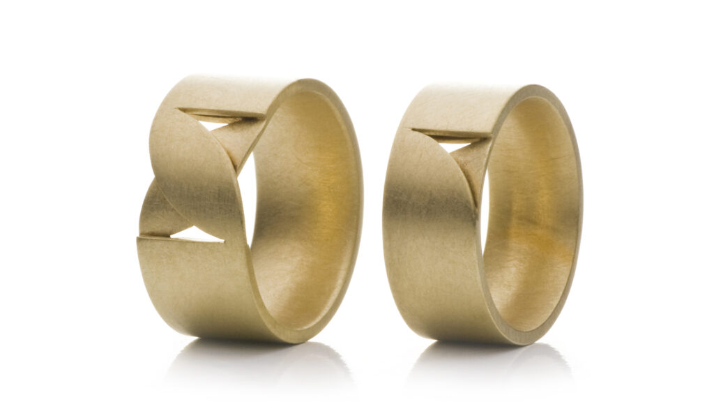 Zwei eigenständige Formen auf zwei Schienen kreuzen sich. Es entsteht etwas gemeinsames Neues. Einmal vollkommen und einmal dezent angedeutet. Diese Ringe sind 9 und 10 mm breit.
