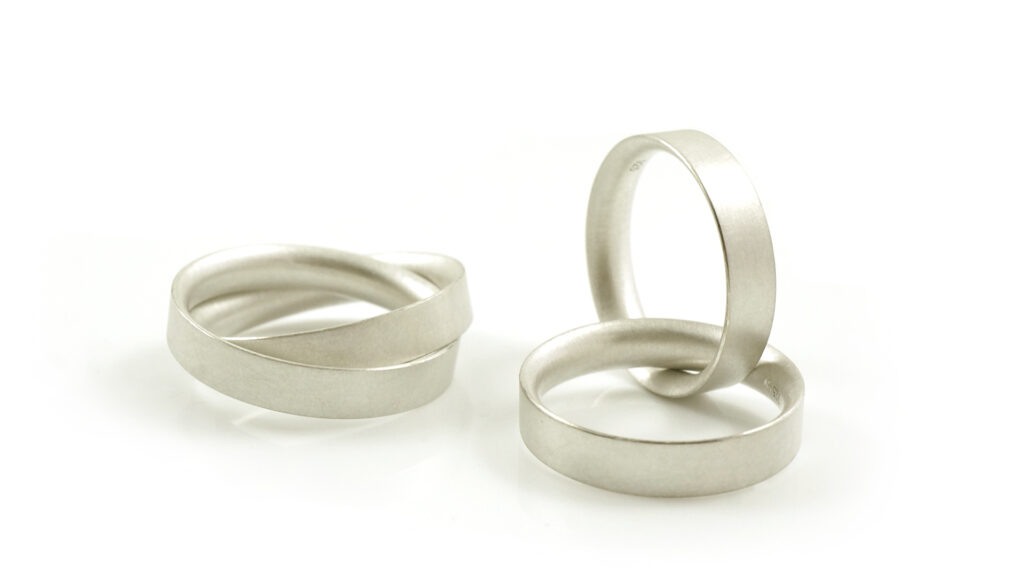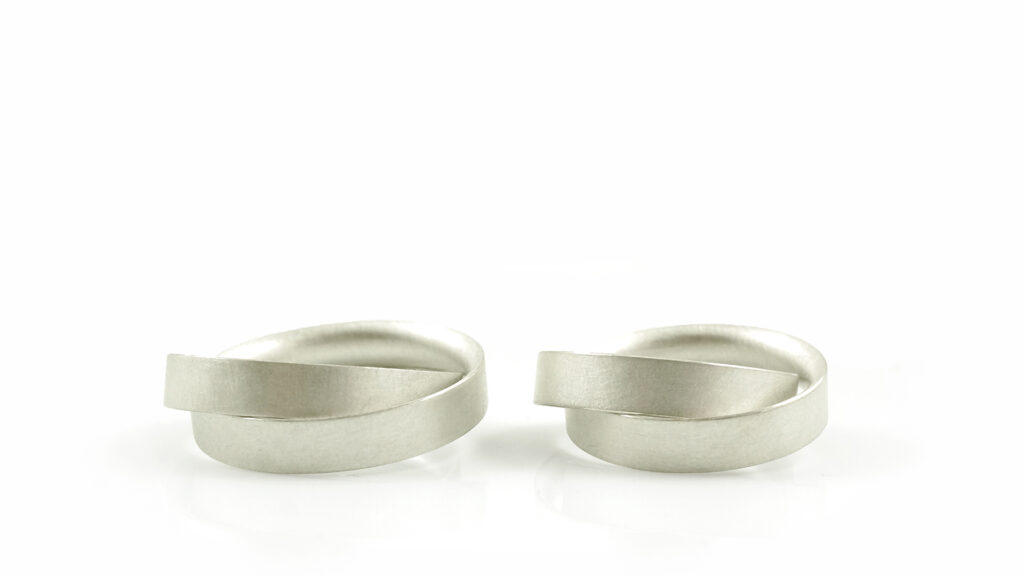 Zwei (Ringe) die aneinander hängen. Diese sehr symbolträchtigen Trauringe überzeugen durch ihre Variabilität und Verspieltheit, weil sie sich immer wieder neu aneinanderschmiegen.