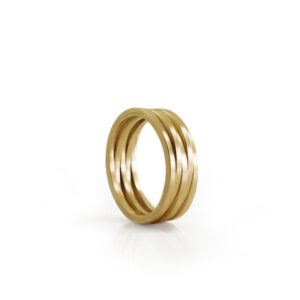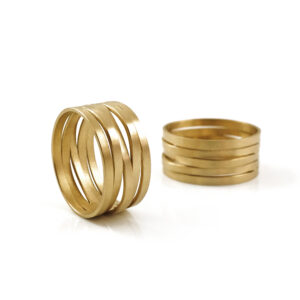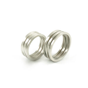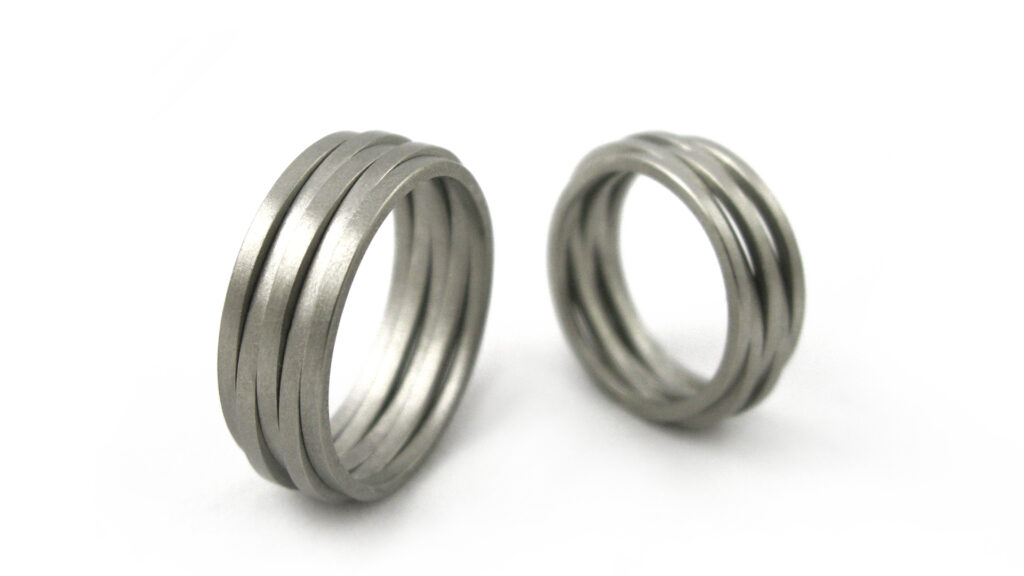Diese individuellen Trauringe sind geordnet wild. Fünf einzelne Ringe werden oval verformt und dann entgegengesetzt miteinander verbunden. Es entsteht eine bewegende Wellenbewegung. Ein Ring ist 7,5mm breit, der Damenring ist 6,5mm breit.